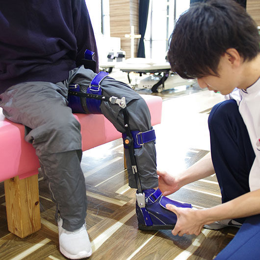 理学療法では、歩行練習などの運動療法や、温熱、電気などの物理療法等を活用して、身体機能や動作の回復を促し、自立した日常生活が送れるよう支援します。電気刺激で筋肉を収縮させる医療機器や、医療用装具を使用したリハビリも実施します。