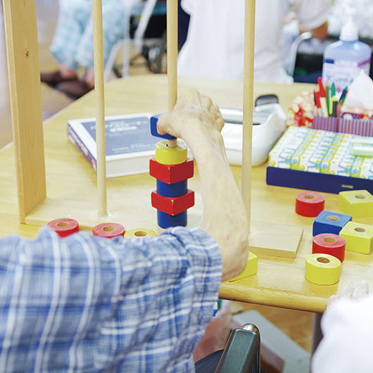 作業療法では、運動療法や生活行為訓練を活用して、家事や仕事等の生活に必要な作業能力の回復を促し、社会適応が出来るようリハビリを実施します。また、自助具を使用した代償的動作の獲得もサポートしていきます。